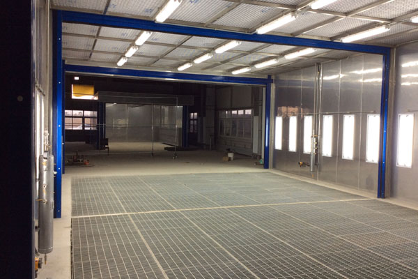 室體是噴漆的工作區域。干式噴漆房的室體以鋼結構支架壁板和玻璃墻板于一體,室體前端設有工件進出通道,側面設有大型采光玻璃窗,室內寬敞明亮。室體的上部設有被動進風過濾層,使空氣按層流狀態均勻的進入噴漆室內。室體頂部的終效過濾層由一塊塊過濾板組合而成,在噴漆室頂部可以很方便地拆裝和清理。室體兩側面均勻布置有多組隔爆照明燈,保證噴漆施工所需要的照度。由于噴漆室內氣流呈垂直向下的層流狀態,而且具有一定的速度,室體壁板和玻璃墻板表面經常被氣流沖刷,幾乎不被漆霧污染,能夠保持明亮和清潔狀態,清理工作量極少。